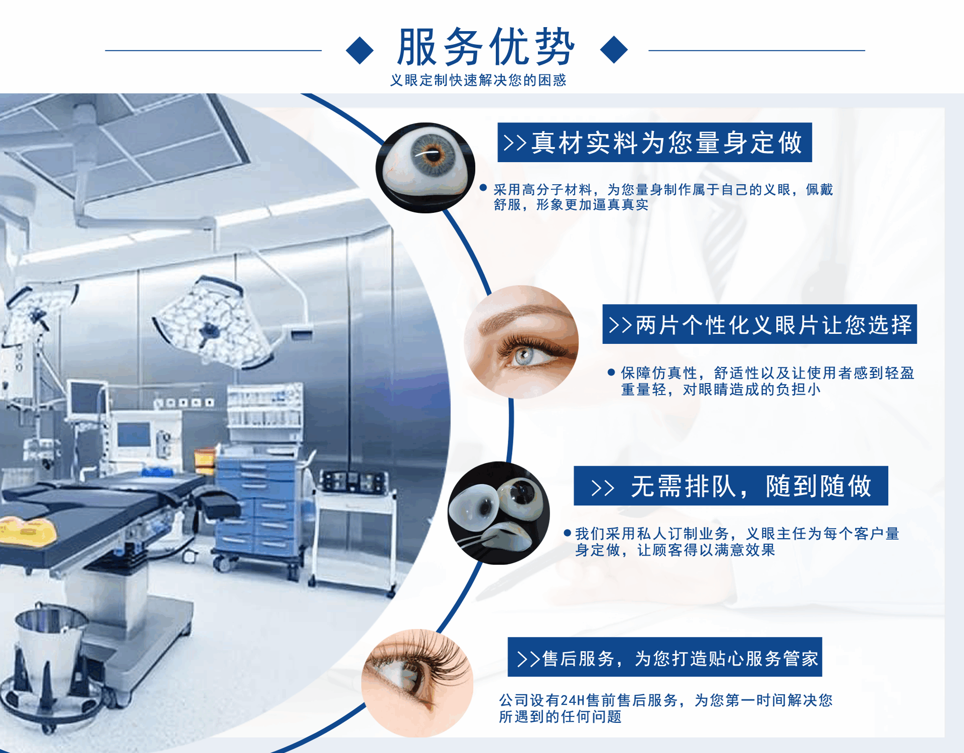 正目醫(yī)療科技有限公司致力于為用戶提供假眼,在哪里可以定制義眼,義眼哪家好,假眼價格,義眼價格,義眼費用,義眼公司,是集義眼定制、保養(yǎng)、咨詢?yōu)橐惑w的綜合性義眼定制企業(yè)。 獨創(chuàng)的義眼工藝結(jié)構(gòu),根據(jù)仿生物學原理,采用進口醫(yī)用植入材料:高分子材料、無毒素、性能穩(wěn)定、堅固耐用)、聚甲基丙乙烯阝-羥乙酯HEMA材料(軟性親水性材料),結(jié)合獨特的義眼個性化佩戴技術(shù),按佩戴者健眼的形態(tài)、角膜、虹膜、及瞳孔的大小、色澤、血管紋理和脂肪分布,設計制作。擁有超薄、質(zhì)輕、光滑、親水透氧、佩戴舒適和高逼真的特點。為保證佩戴效...
